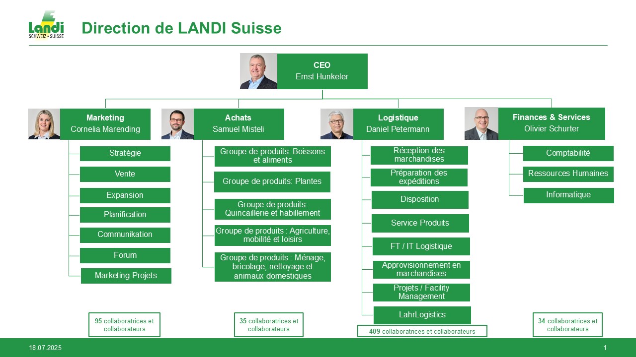 LANDI Suisse emploie environ 400 personnes. L’actionnaire principal de LANDI Suisse SA est la coopérative fenaco. Les autres actionnaires sont la coopérative LAVEBA Genossenschaft St. Gallen et la fédération de coopératives Genossenschaftsverband Schaffhausen (GVS).