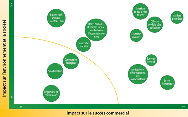 LANDI Suisse propose une grande variété de produits qui sont concernés par les défis mondiaux de la durabilité. En tant qu’entreprise de commerce de détail intermédiaire entre les fournisseurs et les consommateurs, LANDI Suisse a la responsabilité de veiller à ce que son activité commerciale ne se fasse pas au détriment de l’humain, de l’environnement et de la société. Afin d’identifier les thèmes essentiels pour LANDI Suisse, une double analyse de matérialité a été réalisée en 2024. Dans ce cadre, l’importance de l’impact dans une perspective inside-out ainsi que l’importance commerciale dans une perspective outside-in ont été étudiées avec tous les départements et la direction. Cette analyse a défini dix thématiques déterminantes pour LANDI Suisse, qui doivent être étudiées au sein de l’entreprise. Ces thèmes sont classés selon les trois dimensions du développement durable suivantes : « Protection de l’environnement et du climat », « Collaborateurs et engagement social » et « Responsabilité économique ».