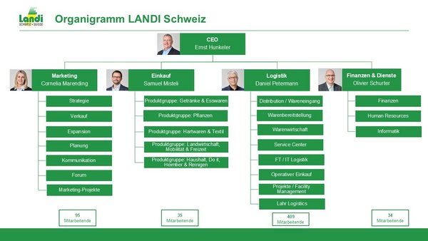 Bei der LANDI Schweiz arbeiten rund 400 Mitarbeitende. Hauptaktionär der LANDI Schweiz ist die fenaco Genossenschaft. Weitere Anteile halten die LAVEBA Genossenschaft St. Gallen und der Genossenschaftsverband Schaffhausen (GVS).